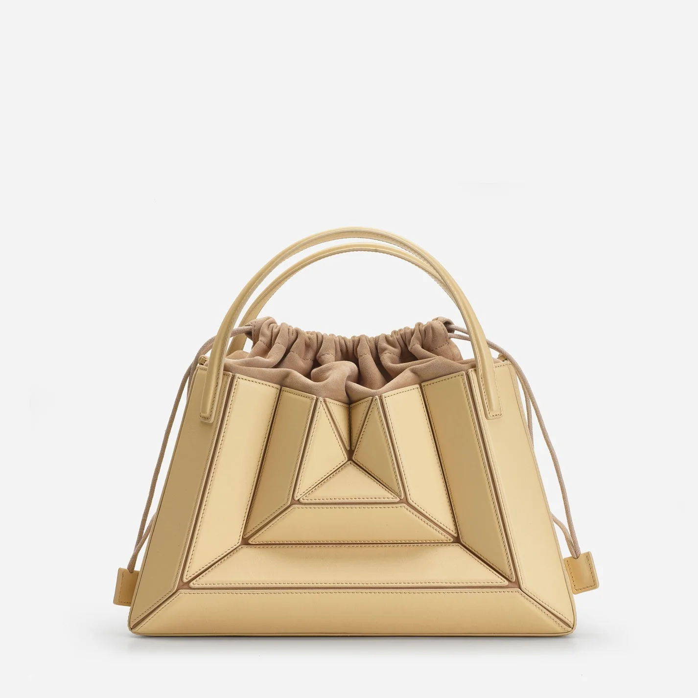 Its exterior design is a surrealist dream, reminiscent of a maze-like structure protruding outwards, with sharp, clean lines, and a 3D façade. Opening the top handles reveals a suede drawstring top edge, securing your belongings on the go.